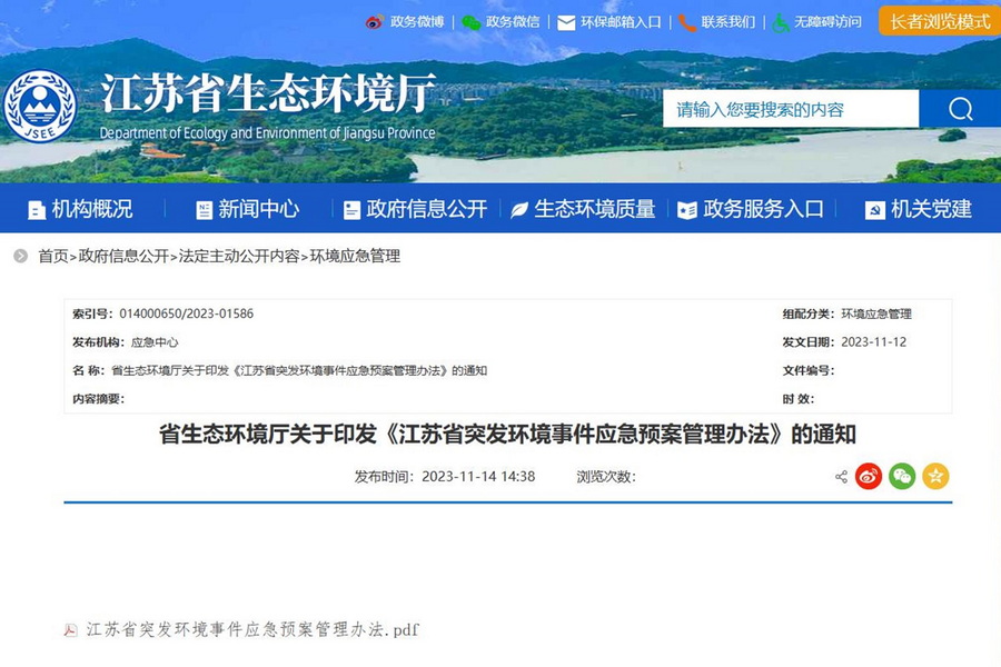 《江苏省突发环境事件应急预案管理办法》正式印发