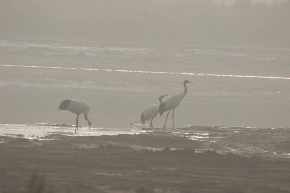 生境修复区竣工后来区内越冬的丹顶鹤家庭
