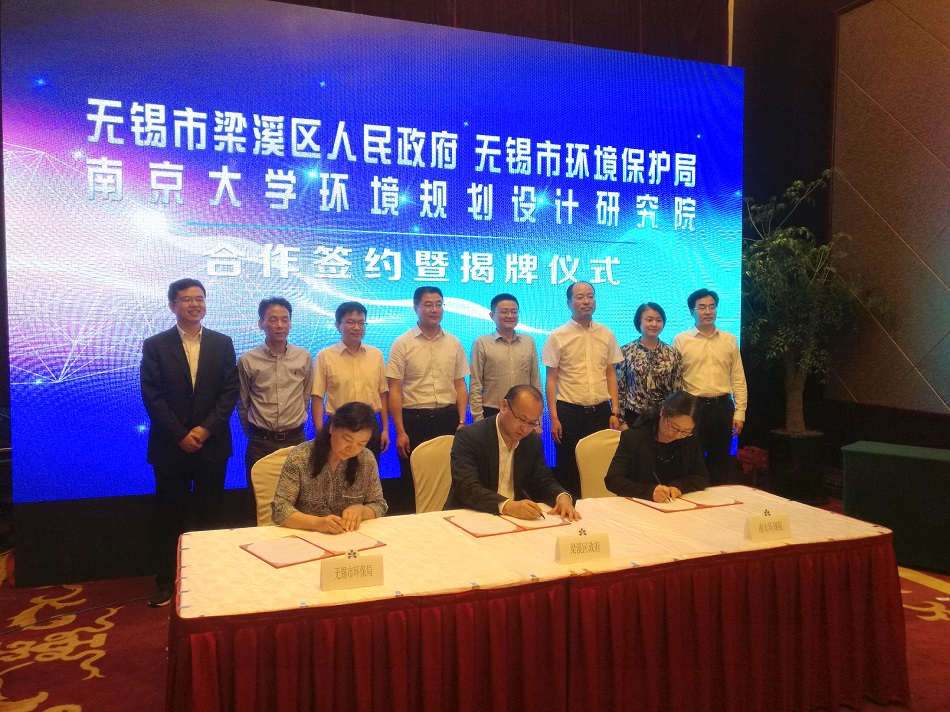 近日,我院与梁溪区政府、无锡市环保局在无锡举行合作签约仪式,并同时对我院无锡分院和入驻的首批项目揭牌。南京大学党委常委、副校长薛海林,梁溪区区长秦咏薪,南京大学资产经营有限公司董事长尹建康,省环保厅生态环境监控中心副主任黎刚,无锡市环境保护局副局长高小萍,南京大学相关部门领导和专家,梁溪区委区政府及相关部门、街道领导,无锡地区校友代表参加了本次活动,签约仪式由梁溪区常务副区长陈红升主持。