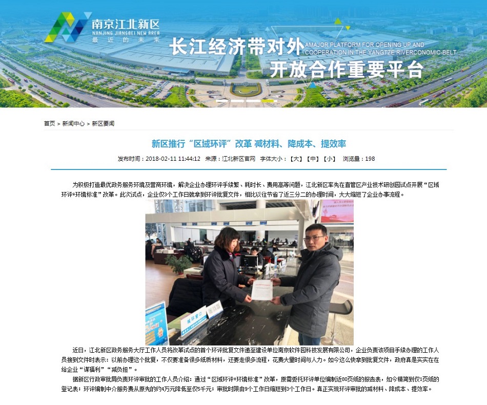 “新区推行‘区域环评’改革 减材料、降成本、提效率”新闻截图  (http://www.njna.gov.cn/xwzx/xqyw/201802/t20180211_5310878.html)
