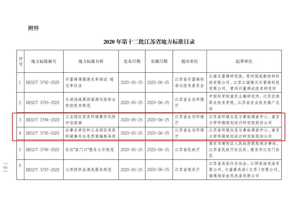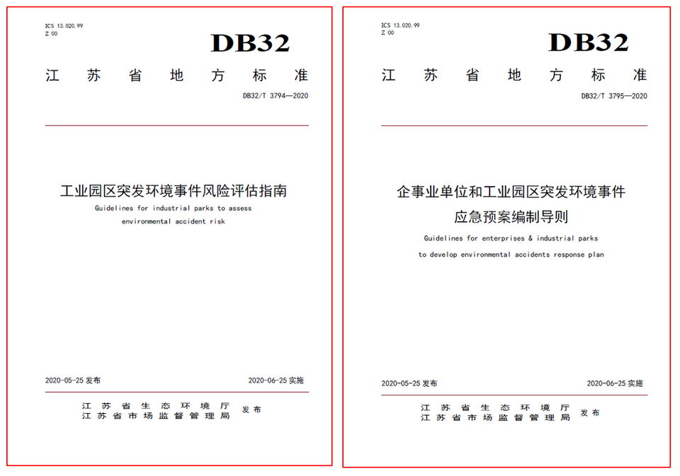 近日,江苏省生态环境厅和江苏省市场监督管理局联合发布了两项地方标准——《工业园区突发环境事件风险评估指南》(DB32/T 3794—2020)和《企事业单位和工业园区突发环境事件应急预案编制导则》(DB32/T 3795-2020),这两项标准由江苏省环境应急与事故调查中心与我院环境安全研究所联合起草,将于2020年6月25日正式实施。