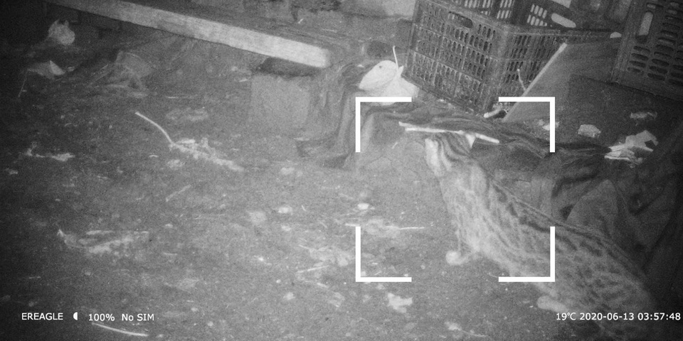 2020年4月,我院生物多样性动物调查团队在对花果山进行走访调查之际,从景区管理处了解到花果山高老庄养鸡场周边深山内长期存在豹猫活动的情况。经咨询后得知,自2016年高老庄生态养鸡场成立以来,不断发生散养鸡被中大型捕食动物叼走情况,但并不清楚是什么动物所为,直至2019年秋季花果山发生一起车辆与不明猫科动物相撞后,经咨询野保部门才知道原来是豹猫。据了解,豹猫在花果山上长期存在,但监测资料十分匮乏。团队在了解情况后,对养鸡场和周边环境进行了细致的研究,在鸡舍入口及豹猫可能经过的区域分别布设了2台红外相机。2020年6月13日约凌晨4点,正对鸡舍的一台红外相机拍摄到了本次的主角——豹猫溜进鸡舍的画面。据养鸡场杨老板反映,这只是周边活动的数个豹猫家族中的其中一只,整个种群估计在6-10只。