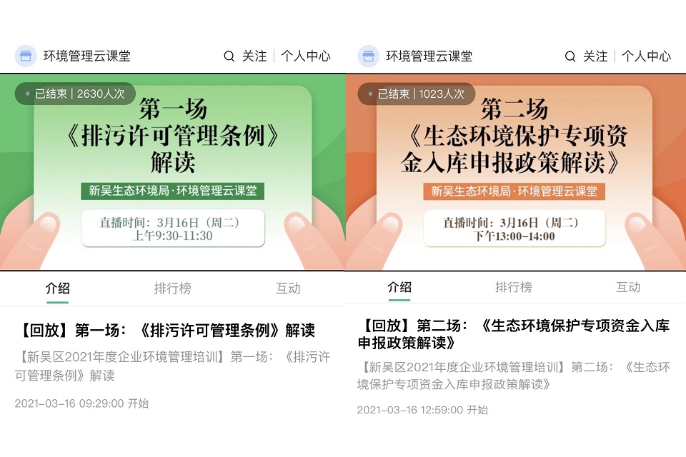 3月16日,无锡市新吴生态环境局通过线上直播的形式,面向全区重点企业开展了2021年度新吴区企业环境管理“云课堂”培训。南大环规院集团两位青年专家应邀为重点企业做了“《排污许可管理条例》解读”和“生态环境保护专项资金入库申报政策解读”两场专题培训,累计吸引3600余人次观看学习。
