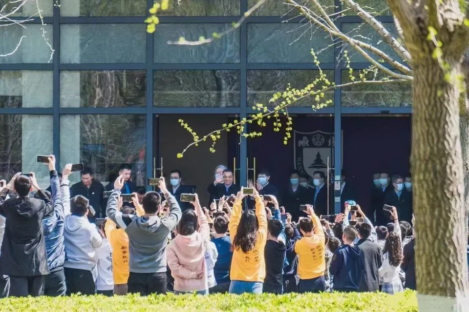“我刚才一入校门的时候,看到你们的电子标牌上,写着诚朴雄伟......”,总理话音未落,同学们便热切地接上下半句:“励学敦行!”“还有一句是嚼得菜根……”“做得大事!”