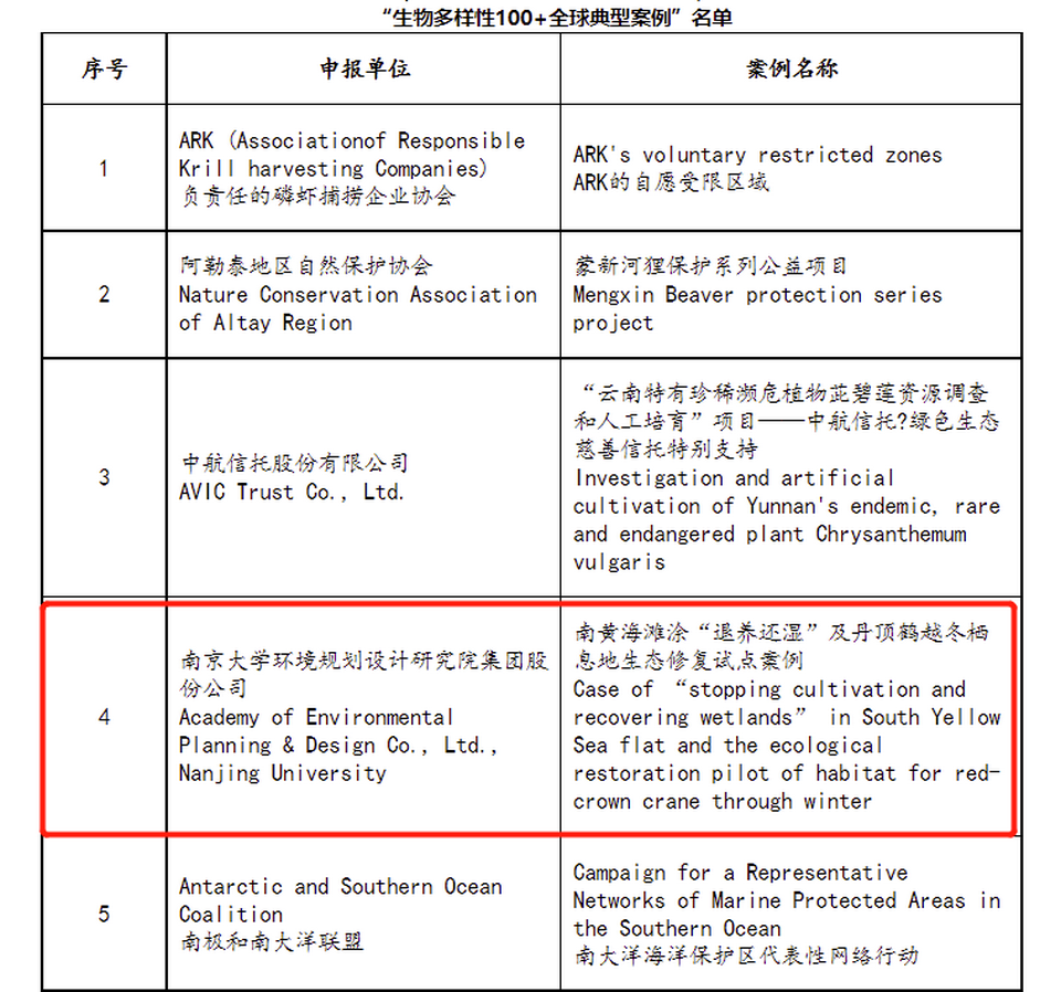 近日,由联合国《生物多样性公约》秘书处、COP15筹委办指导,中华环保基金会、桃花源生态保护基金会主办的“生物多样性100+案例”全球征集与评选落下帷幕。南大环规院集团自然生态所申报的南黄海滩涂“退养还湿”及丹顶鹤越冬栖息地生态修复试点案例,从7个大洲26个国家的众多申报案例中脱颖而出,被评选为“生物多样性100+全球典型案例”。