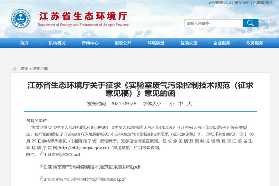 2021年9月28日,由江苏省生态环境厅组织,南大环规院集团工程技术中心牵头起草的《实验室废气污染控制技术规范》(征求意见稿)正式开始征求意见,欢迎广大实验室单位、环保部门、其他企事业单位和个人提出宝贵意见。
