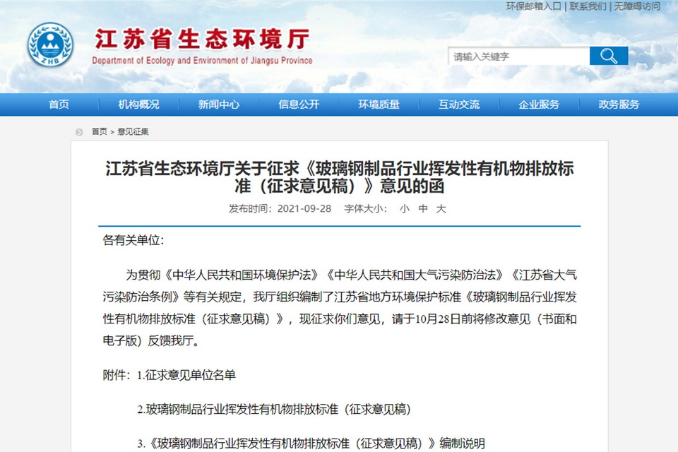 2021年9月28日,由江苏省生态环境厅组织,南大环规院集团环境规划研究院牵头起草的《玻璃钢制品行业挥发性有机物排放标准》(征求意见稿)正式开始征求意见,欢迎广大玻璃钢制品企业、环保部门、其他企事业单位和个人提出宝贵意见。