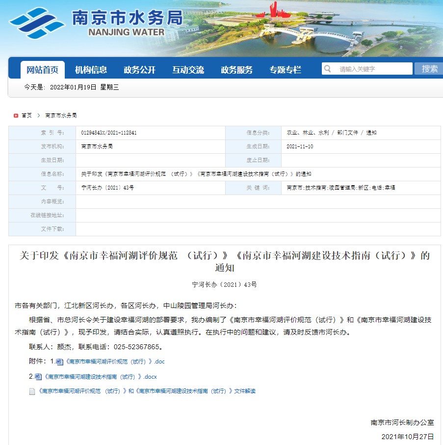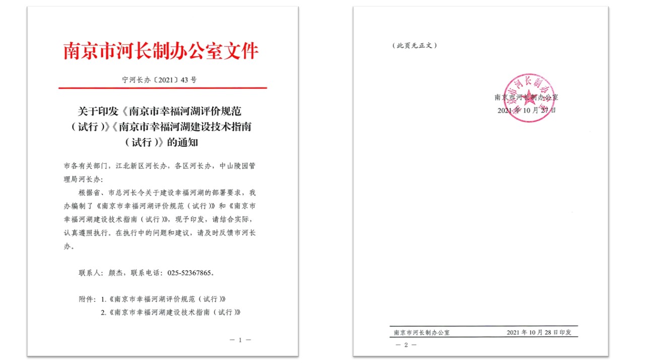 2021年,为响应省总河长1号令和省河长办《关于推进全省幸福河湖建设的指导意见》的相关要求,南京市水务局在全省率先启动幸福河湖评价规范制定工作,南大环规院集团受命承担技术支撑工作。集团环科院水文所的专家团队经过充分调研和分析,秉持科学性、先进性、适用性和可操作性原则,形成了具有南京特色的《南京市幸福河湖评价规范(试行)》,已于近期正式印发。