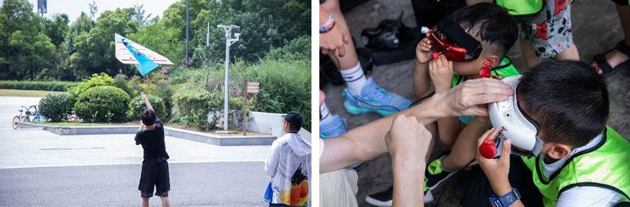 理论课程结束后,大朋友和小朋友一起来到湖滨广场,欣赏专业飞手带来的飞行秀。下午两点似火的骄阳完全抵挡不住大家的热情,穿越机与固定翼上演空中追逐竞赛,在无人机的呼啸声和大家的拍手叫好声中,现场的气氛再一次达到了巅峰,临时抽取的幸运观众还戴上FPV眼镜感受了第一人称视角的穿越飞行,获得了一次难得的体验。