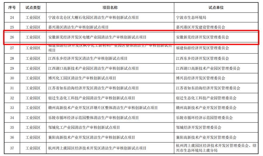 近日,生态环境部公布了第一批清洁生产审核创新试点项目名单,由南大环规院安徽分院和水生态环境研究所联合提供技术支持的“安徽新芜经济开发区电镀产业园清洁生产审核创新试点项目”成功入选,成为本次公示名单中安徽省唯一的试点项目。