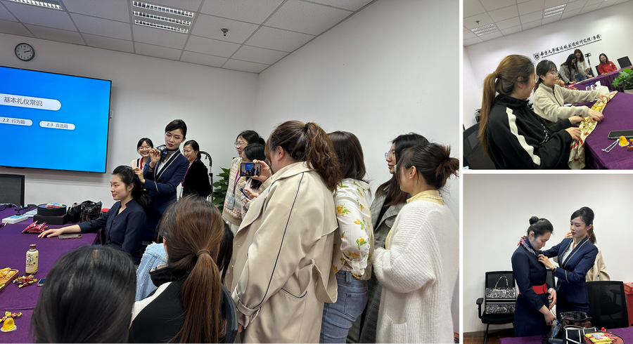 本次培训特邀深圳航空“品牌形象大使”王紫晴乘务长为讲师,就职场礼仪、商务礼仪等内容进行了生动有趣的分享。“理论教学”之外,化妆、换装、盘发等现场互动环节,获得大家热烈响应。