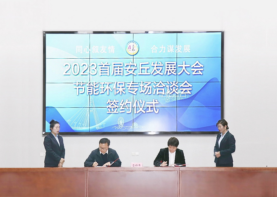2023年4月4日,南大环规院受邀参加2023首届安丘发展大会及节能环保专场洽谈会,安丘市委书记贾勤清出席洽谈会并讲话,集团常务副总裁吴俊锋与安丘市委常委、副市长王晓丽代表双方签订了战略合作协议,会议由安丘市委副书记谭明主持。