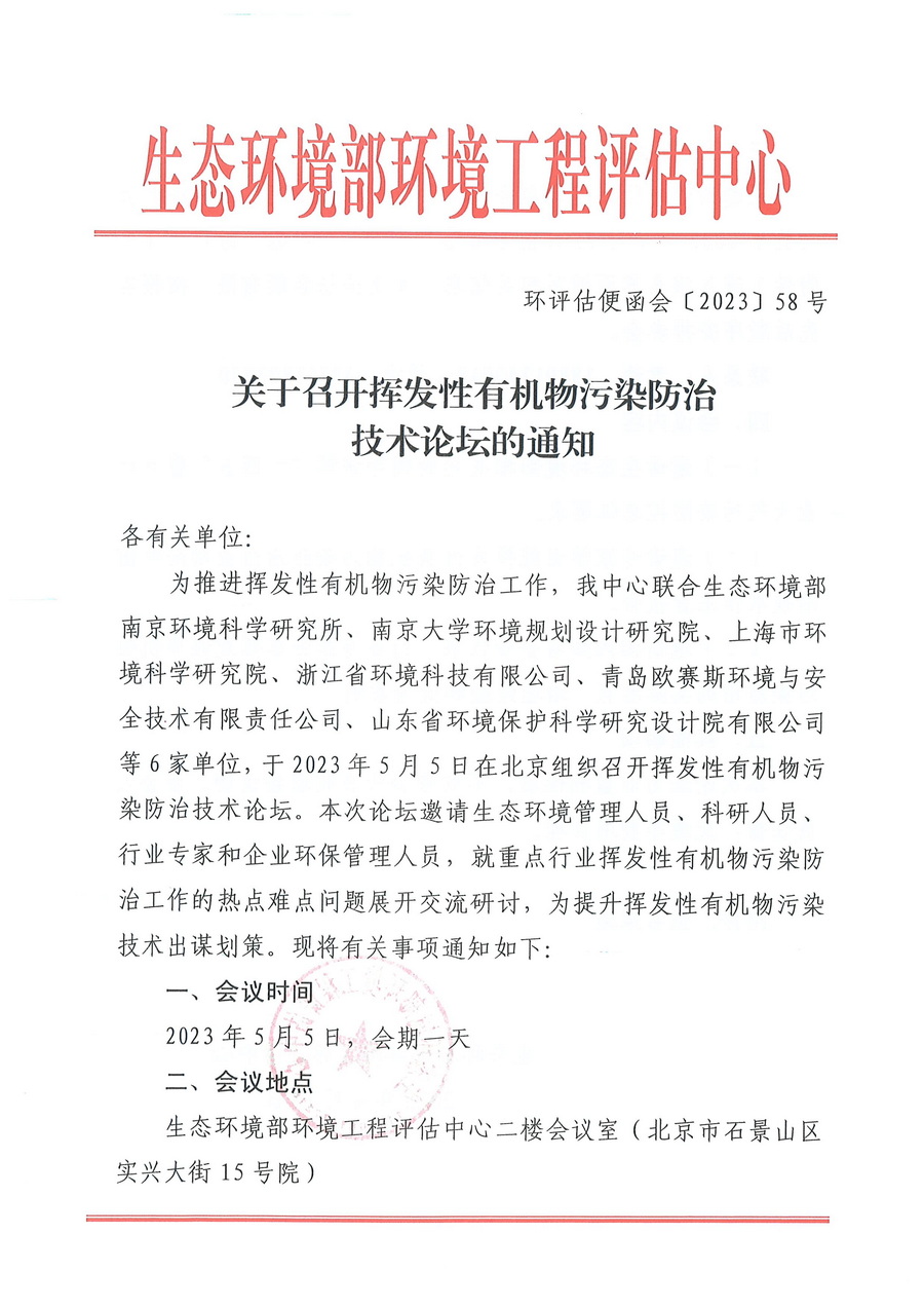 为推进挥发性有机物污染防治工作,由生态环境部环境工程评估中心主办,联合生态环境部南京环境科学研究所、南京大学环境规划设计研究院、上海市环境科学研究院、浙江省环境科技有限公司等6家单位,于2023年5月5日在北京召开挥发性有机物污染防治论坛。