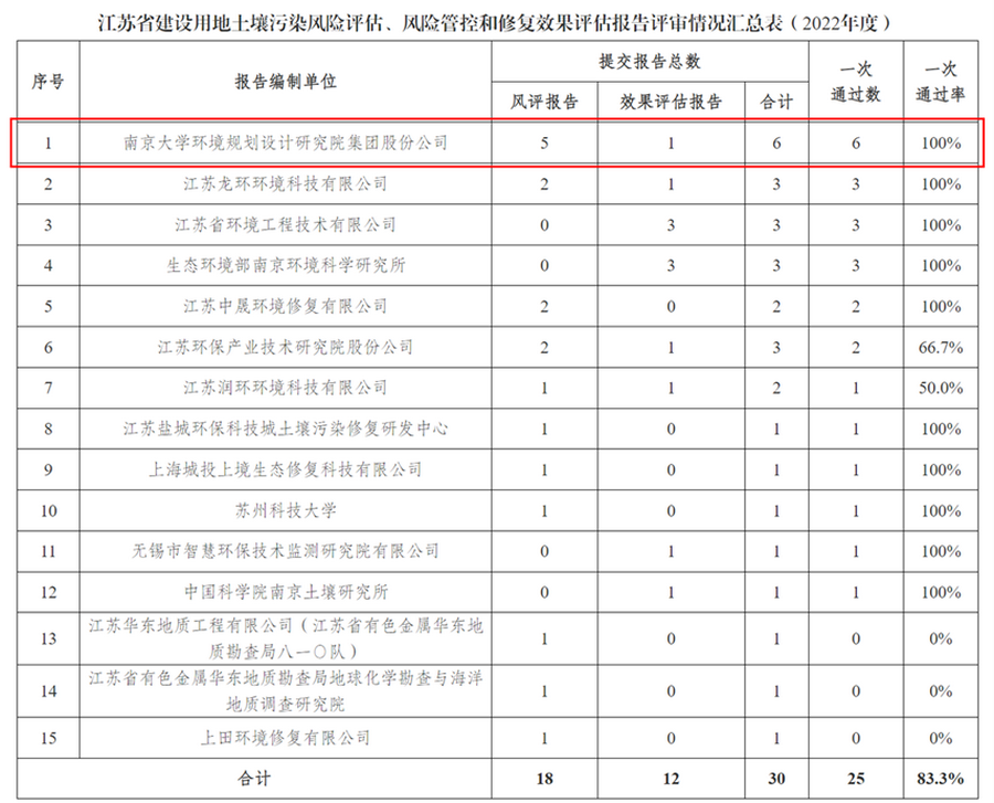 2023年4月24日,江苏省生态环境厅公布了2022年度江苏省建设用地土壤污染风险评估、风险管控和修复效果评估报告评审情况,我院所有报告均一次通过评审,通过率100%,位居全省前列。