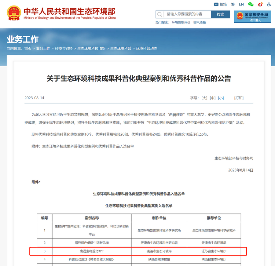 近日,生态环境部科技与财务司公告了“生态环境科技成果科普化典型案例和优秀科普作品”。由江苏省生态环境厅指导、南通市生态环境局委托、南大环规院自然生态所和大气环境与信息化研究所联合设计开发的“南通生物脸谱APP”,喜获十佳典型案例。