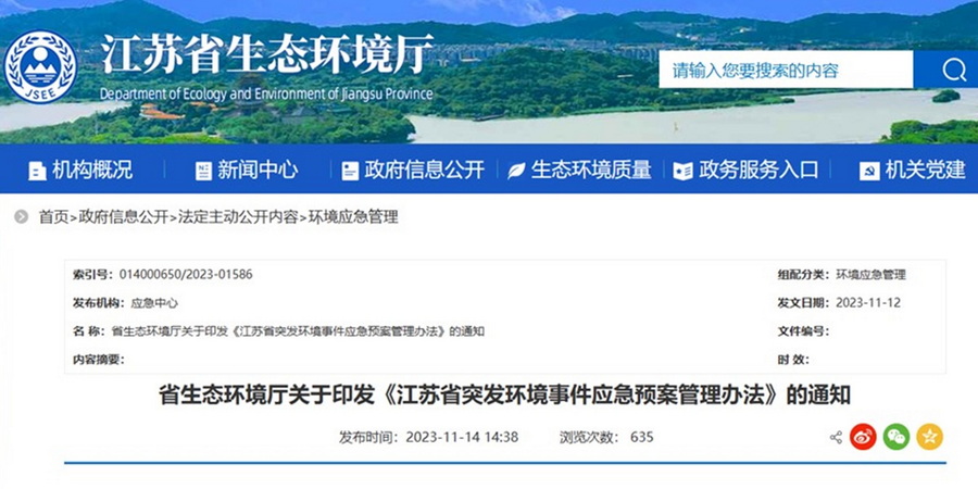 《江苏省突发环境事件应急预案管理办法》正式印发