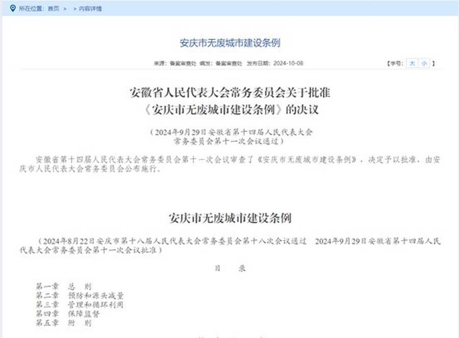 9月28日,安徽省第十四届人民代表大会常务委员会第十一次会议审查了《安庆市无废城市建设条例》,决定予以批准。该《条例》由南大环规院环境健康研究所提供全过程技术支持。